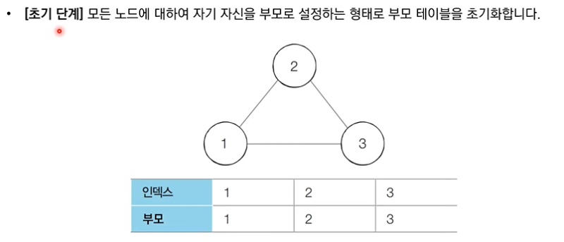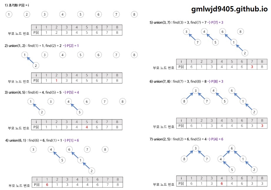 위 그림과 같이 이 알고리즘에서 유의할 점은 union연산을 효과적으로 수행하기 위해 '부모 테이블'을 항상 가지고 있어야 한다는 점입니다.