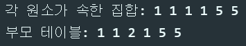 print('각 원소가 속한 집합: ', end="")