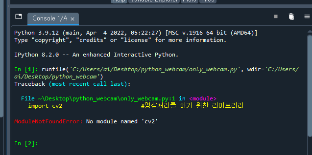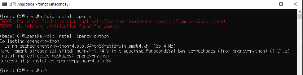 위와 같이 오류가 나오면 anaconda prompt창을 열고 pip install opencv-python입력